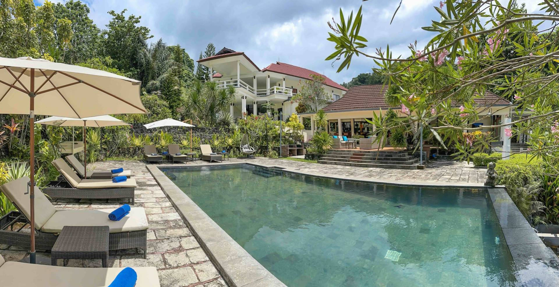 Our Deluxe Rooms at Solitude Lembeh Resort provide a comfortable and well-equipped retreat for divers and nature lovers alike. Located in a charming colonial-style main building, these spacious rooms feature king or twin beds, ensuite bathrooms with hot showers, and modern amenities. Garden-access rooms are wheelchair-friendly, while upper-floor rooms open to a shared outdoor space.